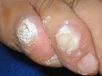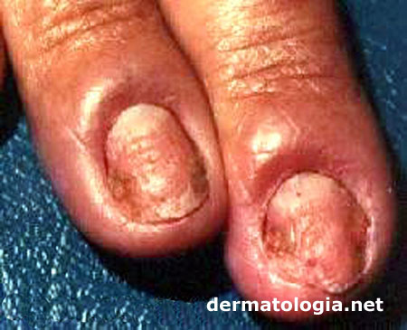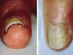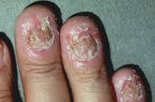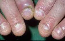 As unhas podem tornar-se espessas, quebradiças, curvadas, descoloradas, infeccionadas e irregulares. Em alguns casos a unha pode cair, e crescer uma nova unha.