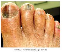 Além disso, uma banda de descoloração muito escura e larga pode sugerir a presença demelanoma. Descoloração na cutícula e dobras na unha também podem ser sintomas desse tipo de câncer.