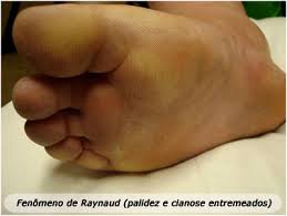 Quando paciente da doença de Raynaud expõe as extremidades do corpo a baixas temperaturas, o suprimento de oxigênio se reduz, e torna a coloração da pele branca, empalidecida, além de fria e às vezes dormente. Quando o oxigênio é totalmente consumido pelas células esgota-se, então a pele adquire coloração azulada ou roxa (chamada cianose).